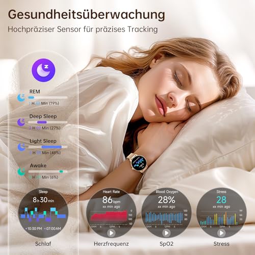 【24/7 Gesundheitsmonitoring】Die Yoever Smart Watch damen erfasst wichtige Gesundheitsdaten – Herzfrequenz, Blutsauerstoff, Schlafanalyse, Menstruationszyklus und Stresslevel – und liefert Ihnen wertvolle Erkenntnisse für mehr Wohlbefinden.