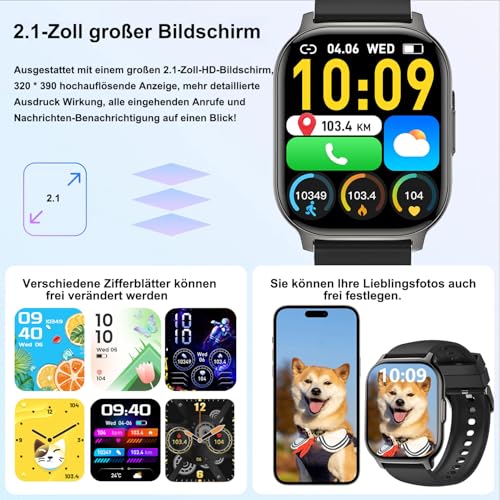 Smartwatch Herren Damen, 2,1″HD Touchscreen Smart Watch mit Bluetooth Anrufe, 110+Sportmodi Fitnessuhr, Herzfrequenzmonitor Schlafmonitor Schrittzähler, IP68 Wasserdicht für iOS Android,(Schwarz)